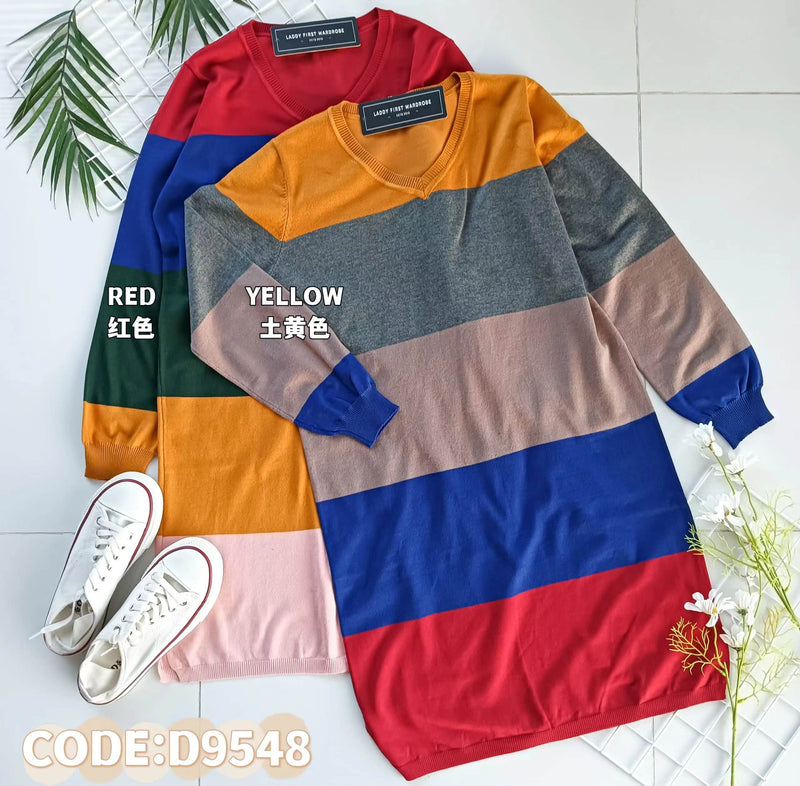 【D9548】V牌针织弹力圆领长袖慵懒休闲风拼色连身裙子 ❤️❤️