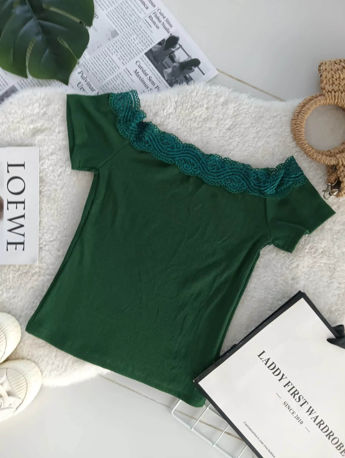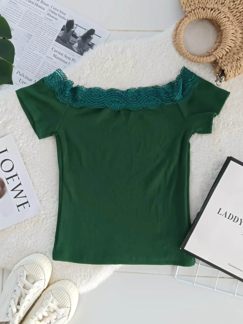 【T17411】针织拼接蕾丝一字肩上衣 ❤️